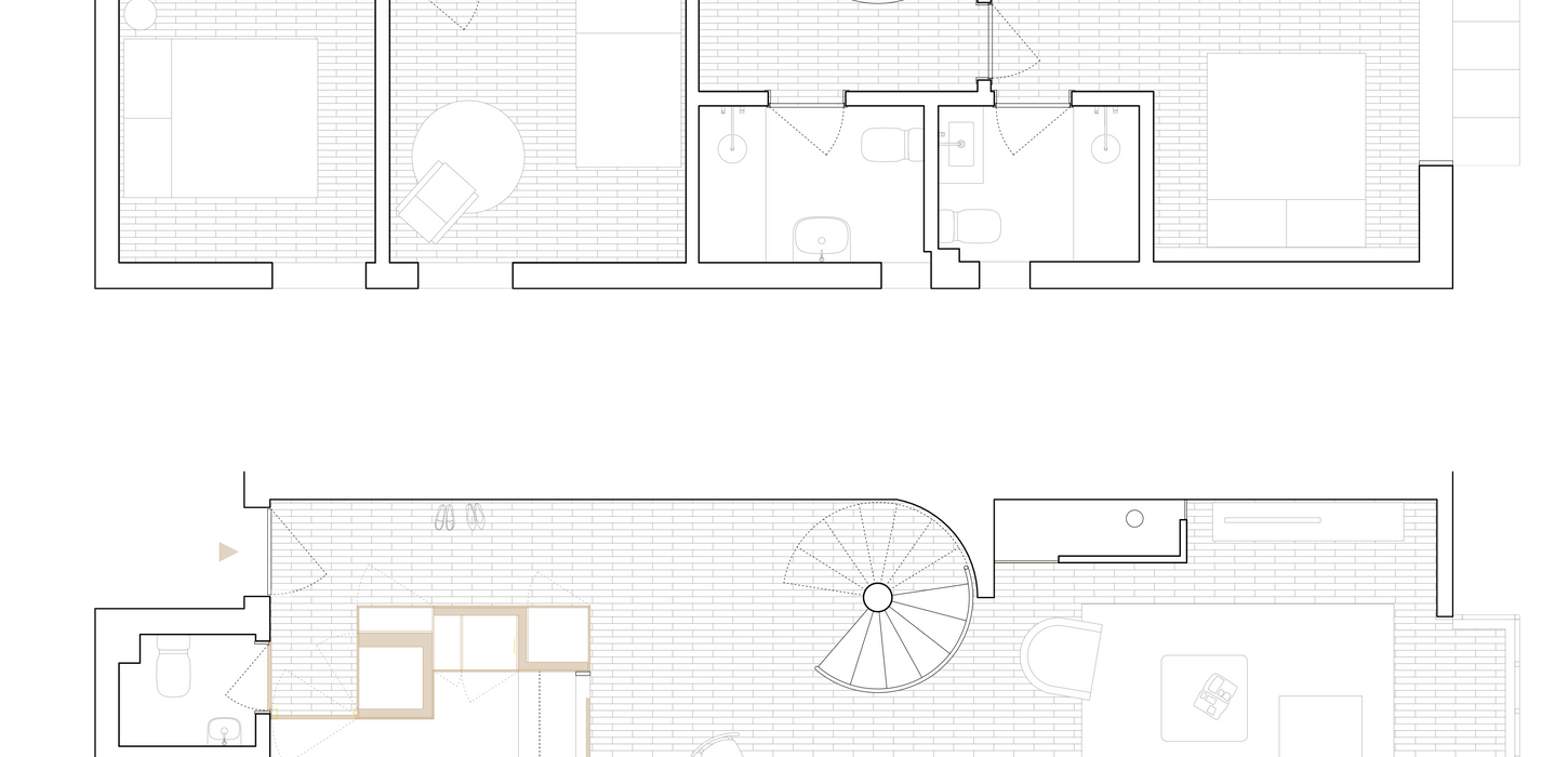 Por uma pequena adaptação da tipologia foi reconfigurada a área de entrada, cozinha e instalação sanitária social de forma a adequar o espaço a novos modos de vida. O restante projecto pretende valorizar os elementos arquitectónicos existentes que configuram uma espacialidade singular da casa.